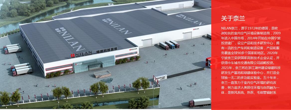 寧波奈蘭環(huán)境系統(tǒng)有限公司(NILAN)源于1972年的德國,是歐洲知名的室內(nèi)空氣環(huán)境設(shè)備制造商,2009年進(jìn)入中國市場,2014年開始在中國寧波投資建廠,設(shè)立產(chǎn)品和技術(shù)研發(fā)中心,擁有一流的生產(chǎn)車間和制造設(shè)備,產(chǎn)品和服務(wù)覆蓋全球90多個國家和地區(qū)。2020年寧波奈蘭榮獲國家高新技術(shù)企業(yè)認(rèn)證,并獲得中車城市交通有限公司戰(zhàn)略投資。2021年,奈蘭將在浙江湖州建設(shè)綠建科技研發(fā)生產(chǎn)基地和綠建體驗(yàn)中心,并打造全球獨(dú)一無二的多功能實(shí)驗(yàn)室。五十年來,奈蘭一直致力于室內(nèi)空氣環(huán)境的研究改善,努力追求人類居住環(huán)境與自然融為一體,是新風(fēng)系統(tǒng)、熱泵、毛細(xì)管輻射系統(tǒng)、被動房配套技術(shù)等產(chǎn)品服務(wù)的優(yōu)質(zhì)品牌廠家,同時在健康綠色住宅領(lǐng)域有著深厚沉淀,奈蘭健康住宅七度空間一體化解決方案,即“THONFIE”毛細(xì)七恒系統(tǒng),在國內(nèi)外民、商、政等各領(lǐng)域有著豐富的項(xiàng)目案例應(yīng)用實(shí)踐經(jīng)驗(yàn),深受行業(yè)認(rèn)可和用戶喜愛——奈蘭,讓家融于自然!